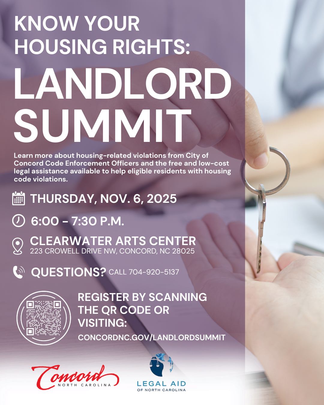 The City of Concord’s Planning & Neighborhood Development Department is partnering with our Code Enforcement officers and Legal Aid of NC, Inc. to offer a "Know Your Rights: Landlord Summit" on Thursday, November 6, 2025, at the ClearWater Arts Center & Studios. The address for this event is 223 Crowell Drive NW, Concord, NC 28025.