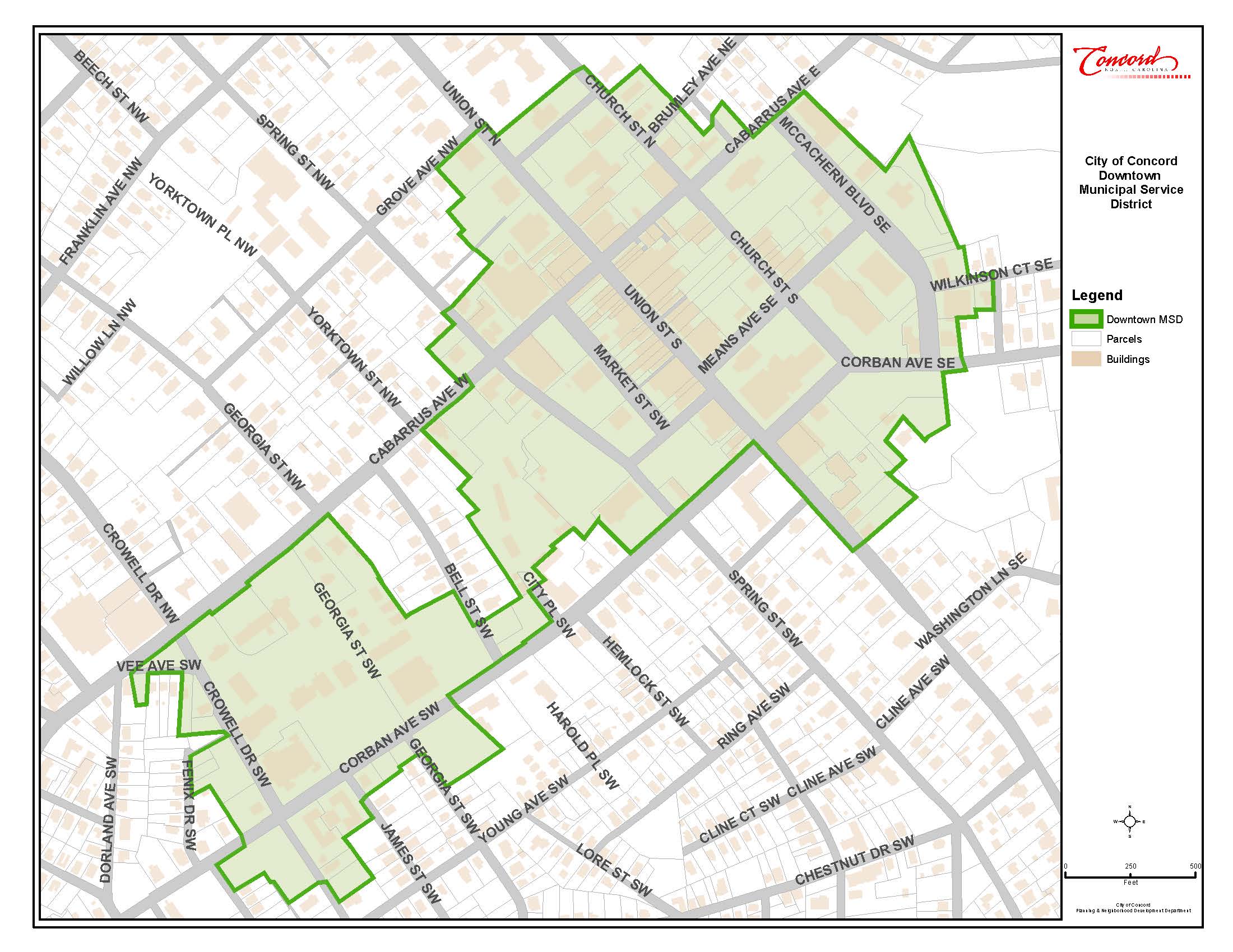 North Carolina General Statutes allow cities to create Municipal Service Districts. City ordinance specifies the creation of a Municipal Service District (MSD) in the downtown area. Property within this district is taxed at an additional tax rate on top of the ad valorem tax rate for the general city. The tax rate for Concord and the additional MSD tax rate are available on the Cabarrus County Tax Rates web page. All the revenue collected from the MSD is utilized by the City of Concord for infrastructure and other improvements inside the district.