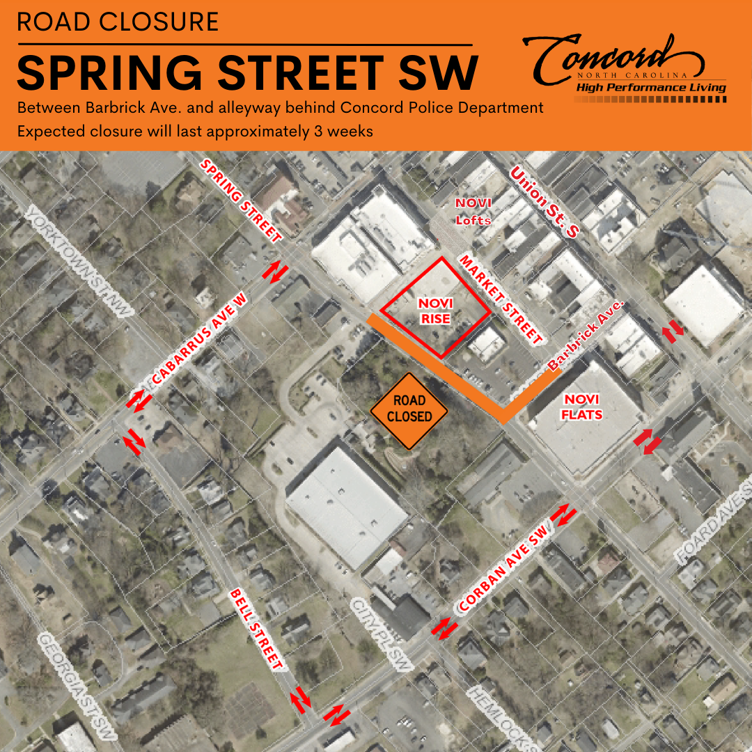 Contractors working on the new Novi Rise mixed-use property in Downtown Concord will close Spring Street SW between Barbrick Avenue SW and the alley behind the Concord Police Department beginning Monday, February 21 at 9 a.m. The closure will last approximately three weeks while contractors will perform necessary utility work.