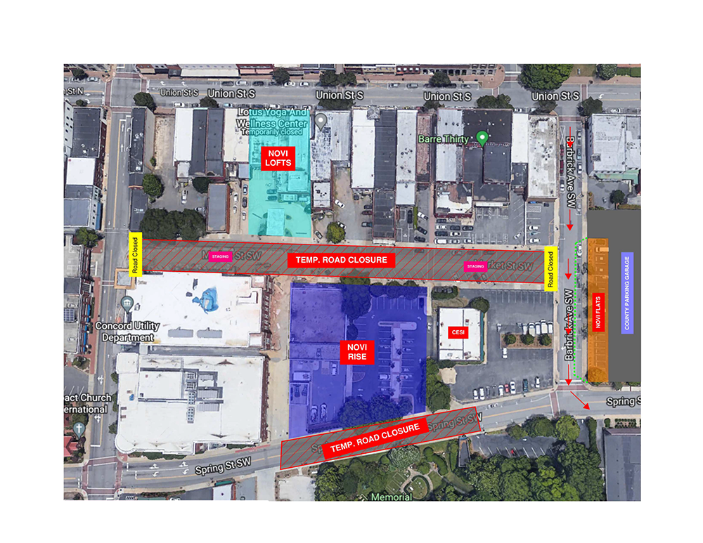 Progress continues on the three residential and mixed-use Novi properties that will enhance Downtown Concord as a destination for high-performance living, dining, and entertainment. Closures on Market Street SW are planned beginning Wednesday, March 16 to allow construction crews to begin installation of a 155-foot tower crane with a 177 foot working radius on the site of the future Novi Rise property.