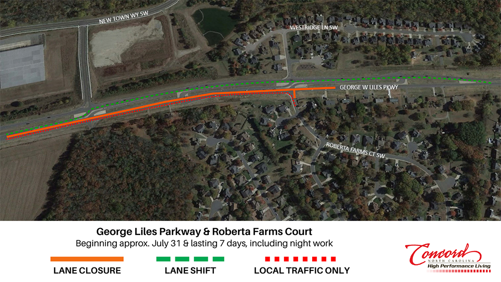 On Monday, July 24, City of Concord contract crews will begin work to replace pavement in the intersection of George Liles Parkway and Roberta Farms Court SW. The pavement in this intersection is failing due to a previous water main break.
