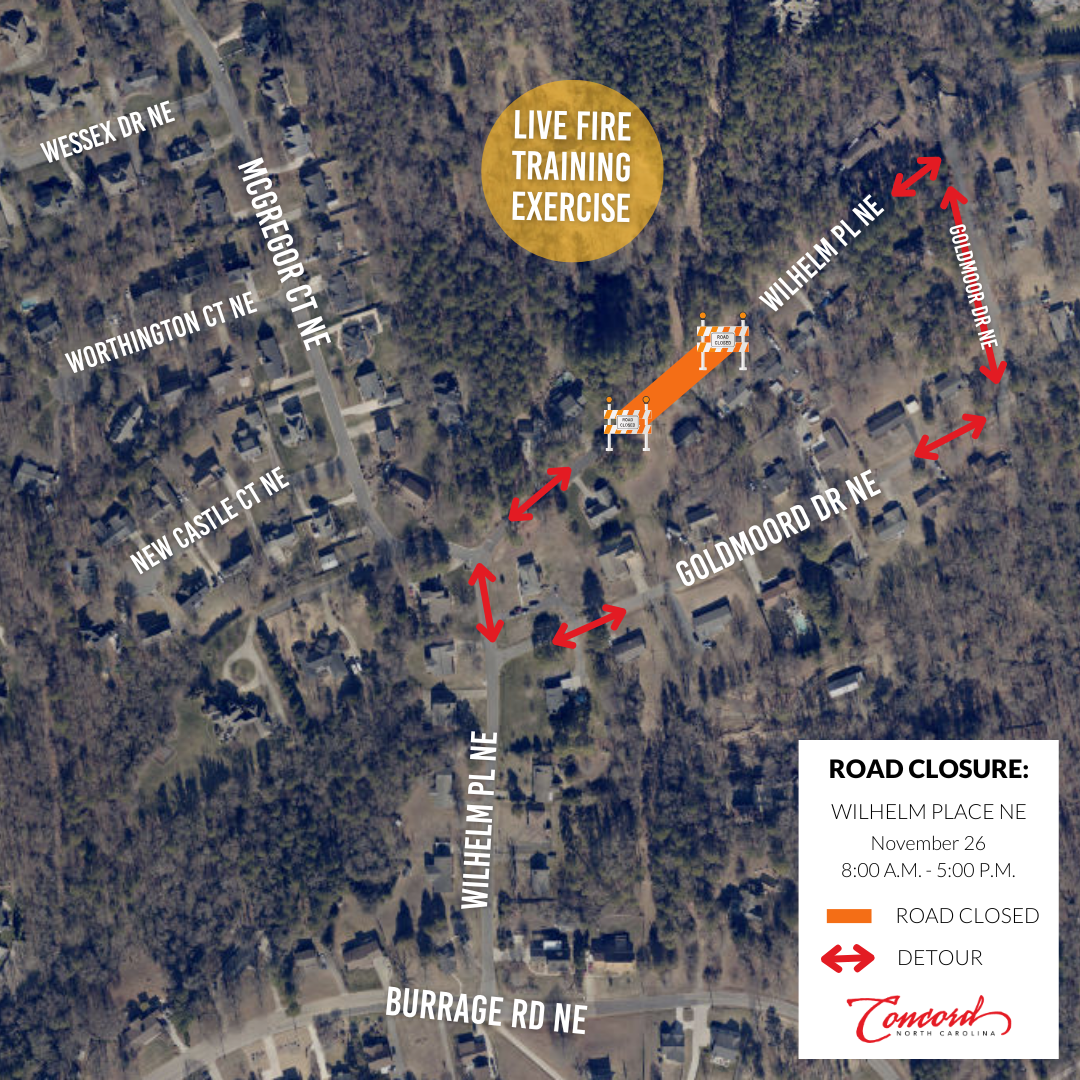 The Concord Fire Department will conduct a live-fire training exercise in an acquired structure at 541 Wilhelm Pl, NE on Tuesday, November 26 from 8:00 a.m. – 5:00 p.m. During the training exercise, a portion of Wilhelm Place NE, between McGregor Dr. NE and Goldmoor Dr. NE, will be closed. Residents in the area may see smoke and can expect a large fire department presence at the scene.