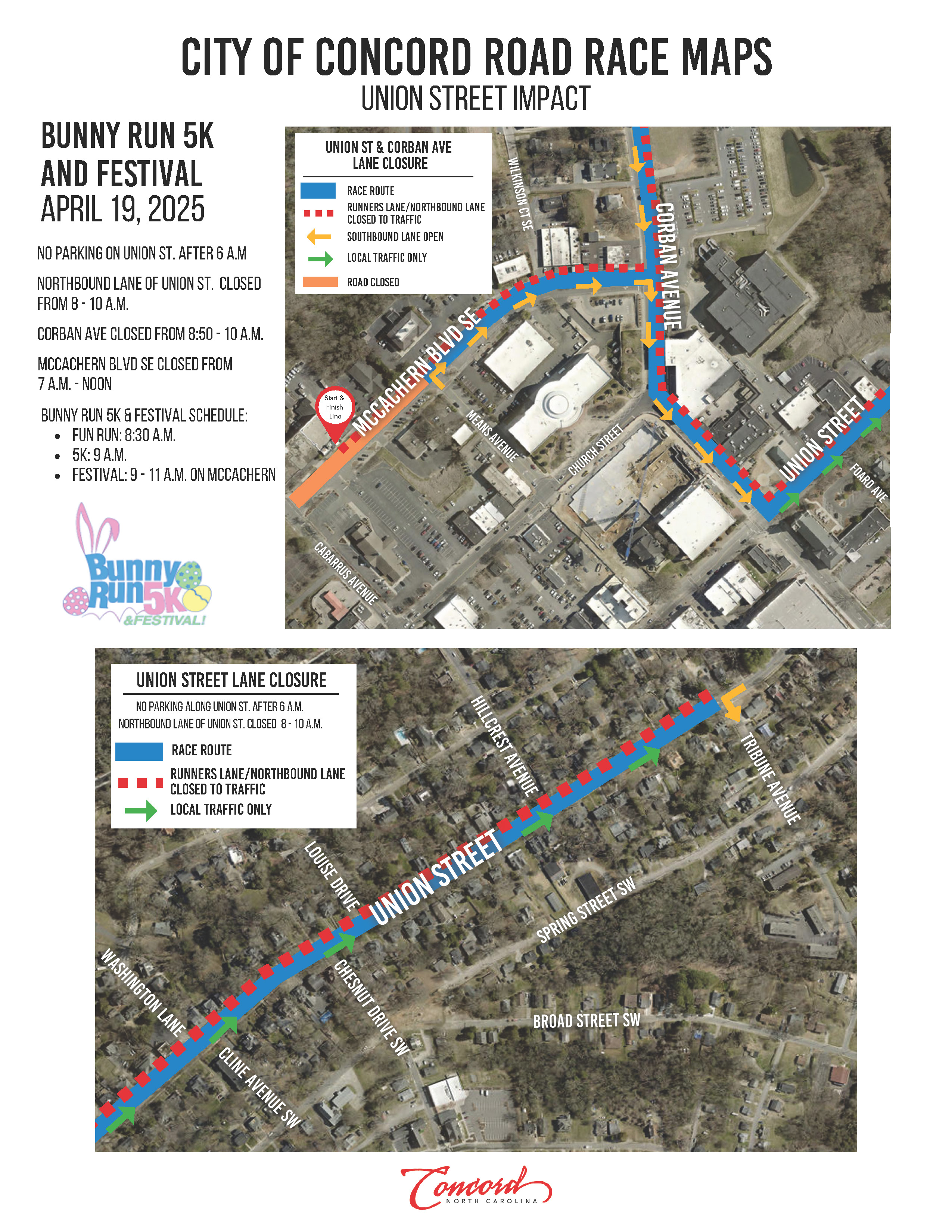 City of Concord government offices will be closed on Friday, April 18, for Good Friday. The annual Bunny Run 5K & Festival will take place on Saturday, April 19 on McCachern Boulevard in Downtown Concord. The event kicks off with a free one-mile fun run at 8:30 a.m. and festival activities along McCachern Boulevard begin at 9 a.m. During the event, McCachern Boulevard will be closed to through traffic, and lane closures will be in effect on Union Street South and Corban Avenue on Saturday morning to accommodate the Bunny Run 5K race route.
